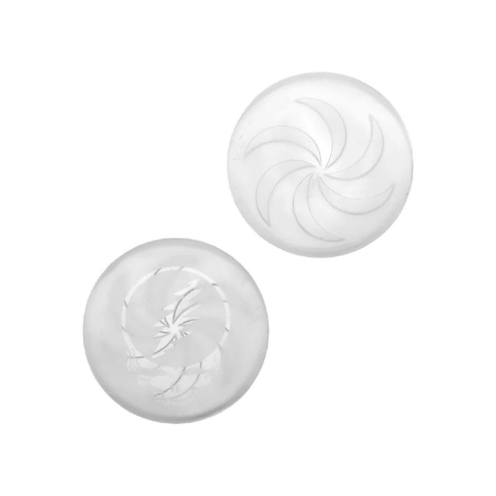This rig set has nothing but the best in store for all the Deadhead dabbers out there; includes a custom fully-welded seamless banger etched with the band's logo on the front. This type of joint is more durable than a standard weld and stands the test of time just like the music. A sandblasted spinner disc carb cap rests on top creating a vortex airflow to whirl the two terp pearls around the banger's bucket, ensuring even melting and vaporization. The glass dab tool is decorated with a Stealie marble and the luxury gift box brings this setup all together.