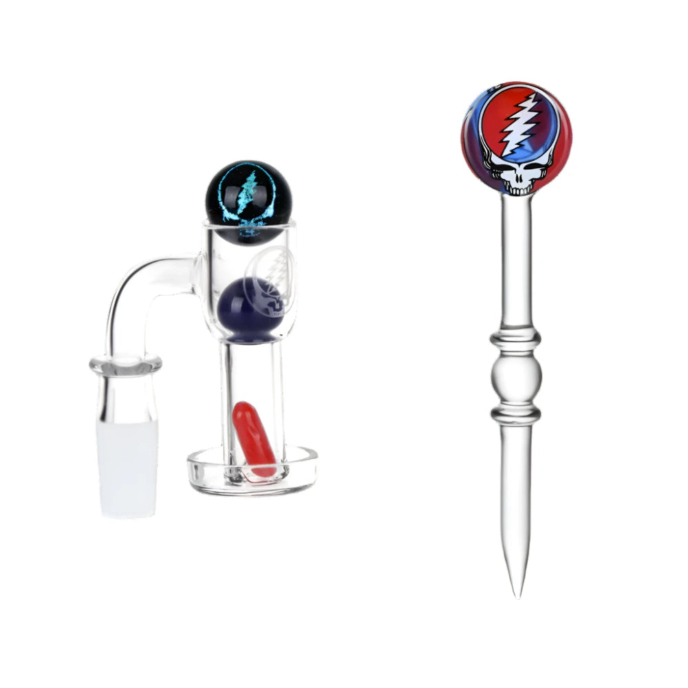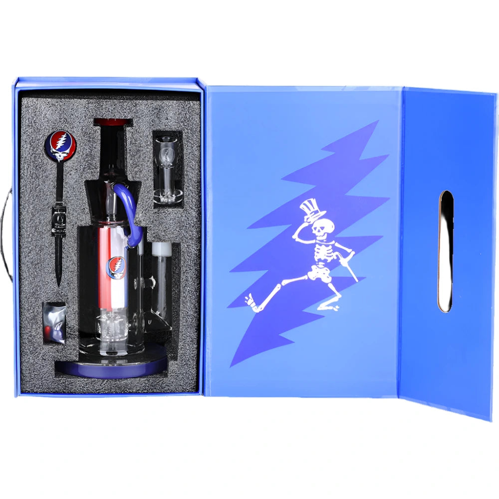 This rig set has nothing but the best in store for all the Deadhead dabbers out there; includes a custom fully-welded seamless terp slurper banger. This type of joint is more durable than a standard weld and stands the test of time just like the music. A marble carb cap restricts the airflow within the banger, pulling air in through the vortex slits at the base. This spins the terp pill insert and stirs concentrate to ensure consistent melting. The glass dab tool is decorated with a Stealie marble and the luxury gift box brings this setup all together.